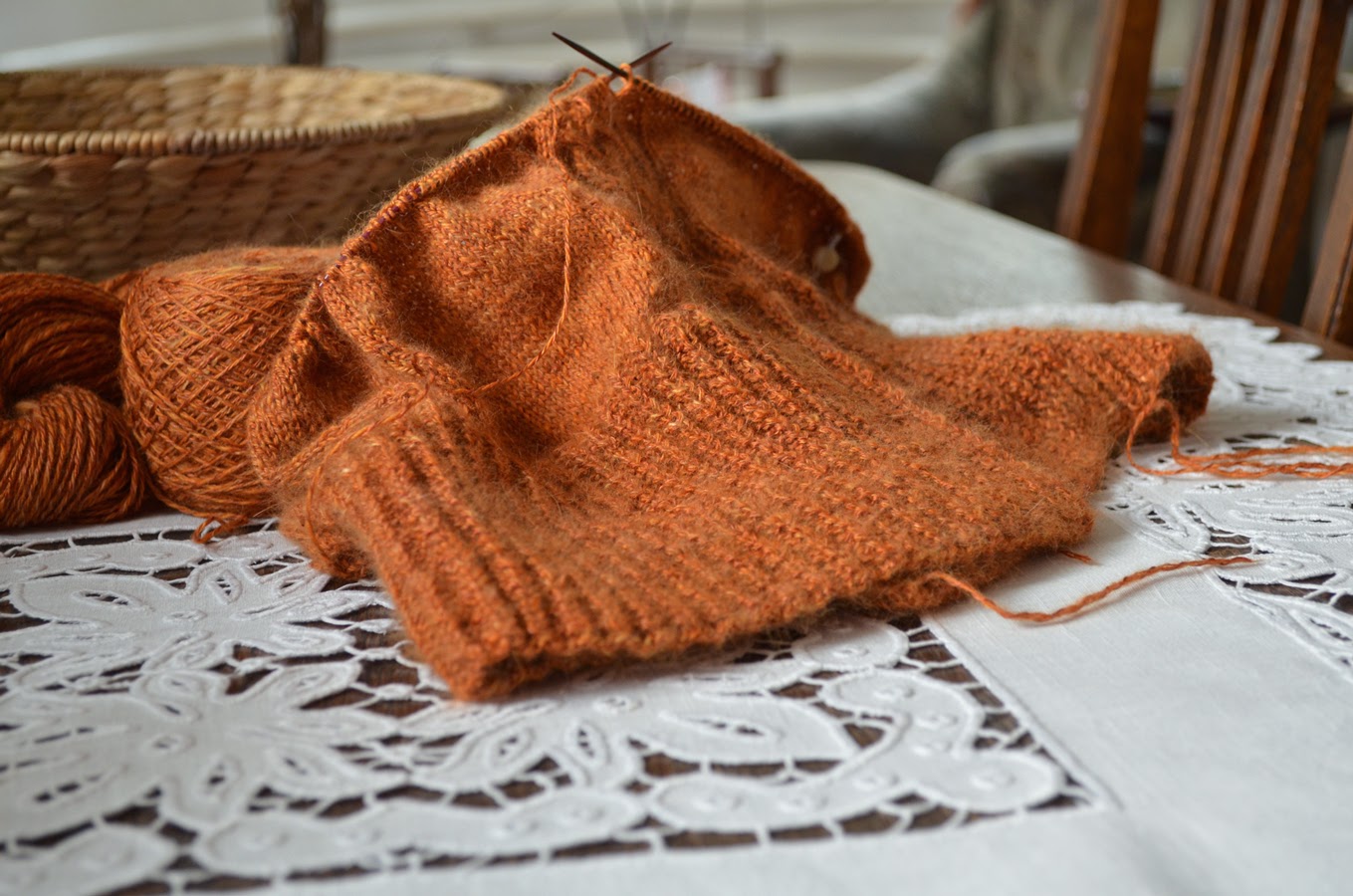 Przędę też ale nieprzesadnie, skończyłam prząść 3-nitkę na angorowy sweter (chociaż jedwabiu ma w składzie znacznie więcej) jak pisałam już na początku wiedziałam, że ufarbowałam za mało czesanki ale zamiast całkiem prostego golfiku zaczęło to ewoluować w stronę czegoś bardziej skomplikowanego.
