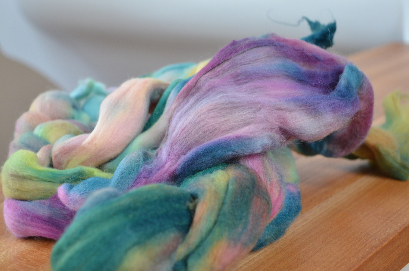 Czesankę kupiłam wyjątkowo wielobarwną z premedytacją, by te wybarwienia pokazały mi jak została zafarbowana, mam takie odczucia jakby było to farbowanie dwu-etapowe. Pierwsze odbywało się w kąpieli wodnej a drugie już bardziej wygląda na powierzchowne nałożenie farby.