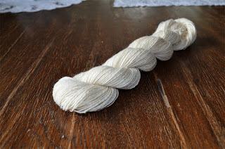 Pierwszy motek powstał z resztki mojej autorskiej mieszanki, którą na moje życzenie przygotowano z : 37,5% - merynosa z Falklandów, 25% - włókna perłowego, 25% - bambusa, 12,5 % - lamy (wersja uszlachetniona). Resztka jest pięknie biała i taka inna w dotyku od wełnianych mieszanek, bo roślinno-wiskozowy dodatek daje się odczuć. O dziwo jak przędłam tą czesankę by się z nią zapoznać jak ją dostałam to mi się nie podobała, przez różnorodne materiały przędło mi się źle - teraz przędło się cudownie jakoś tak zupełnie inaczej po prostu sama się skręcała. Czyżby stan ducha miał znaczenie :)
